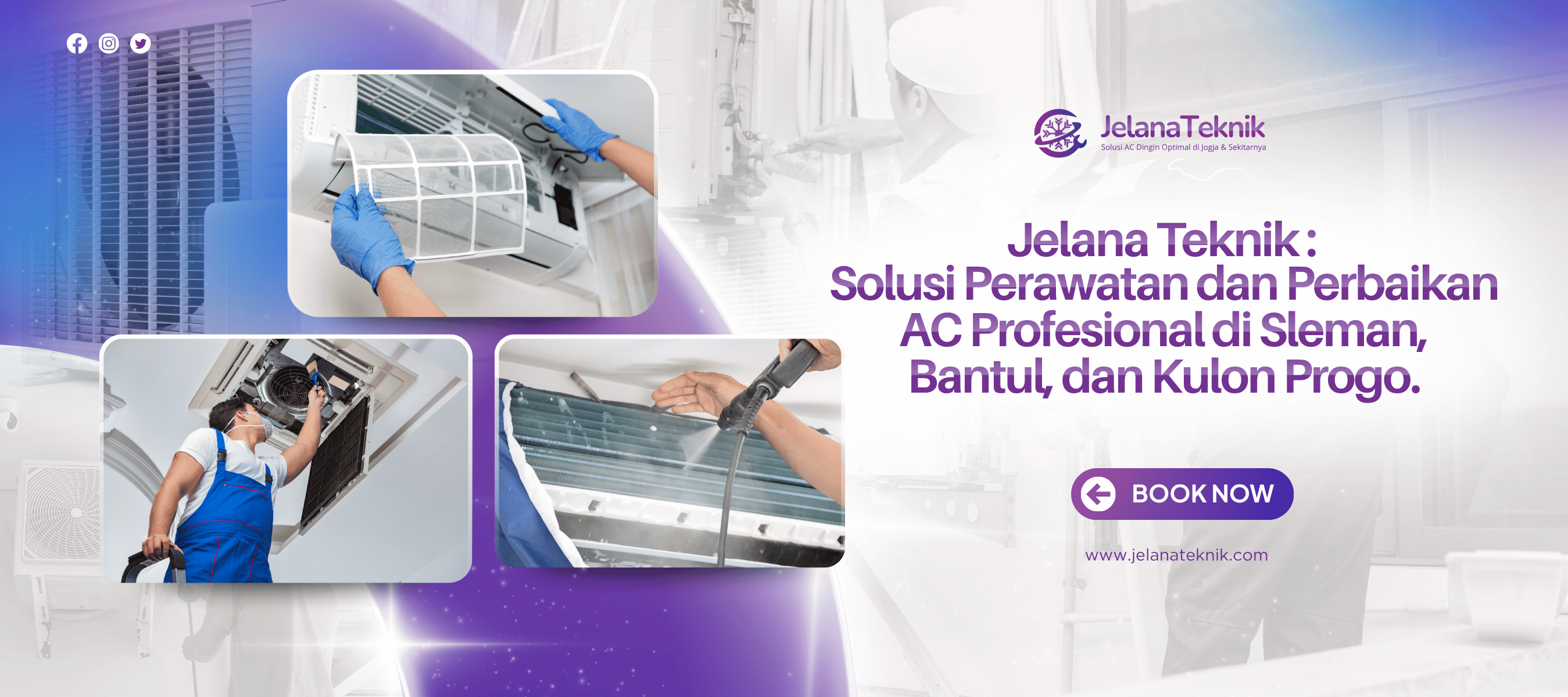 Jelana Teknik melayani jasa perawatan, pemasangan, dan perbaikan AC di Yogyakarta dengan tenaga teknisi berpengalaman. Kami menangani berbagai kebutuhan AC untuk rumah, kantor, hingga bangunan komersial di area Sleman, Bantul, dan Kulon Progo.